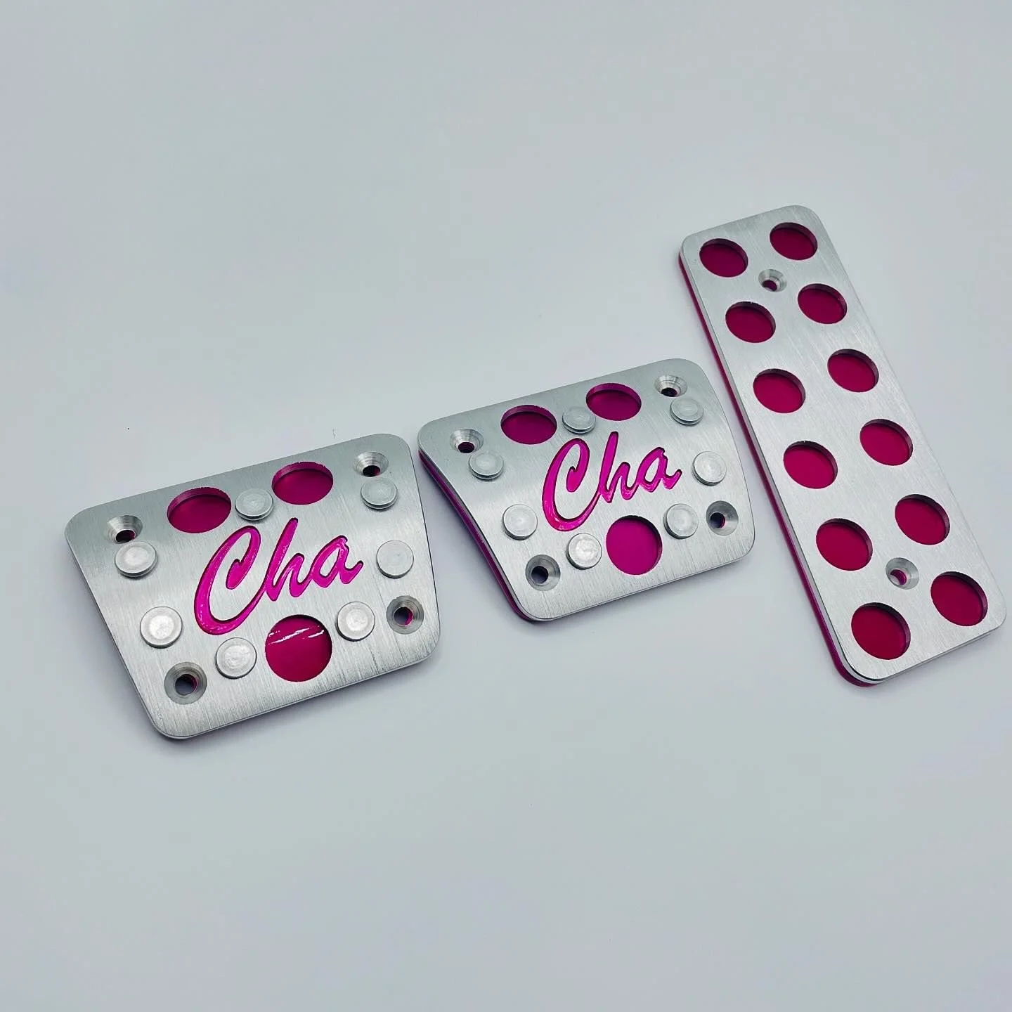 Both pieces of the break and clutch pedals are then powder coated in Sparkling Berry by our friends over at DFW Coating. (Only the back piece of accelerator pedal is powder coated) Once both pieces are powder coated, the front pieces then taken and resurfaced in the machine leaving a grippy texture on the pedal and also leading the Cha Cha exposed in the pedals glowing in the Sparkling Berry.